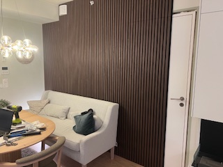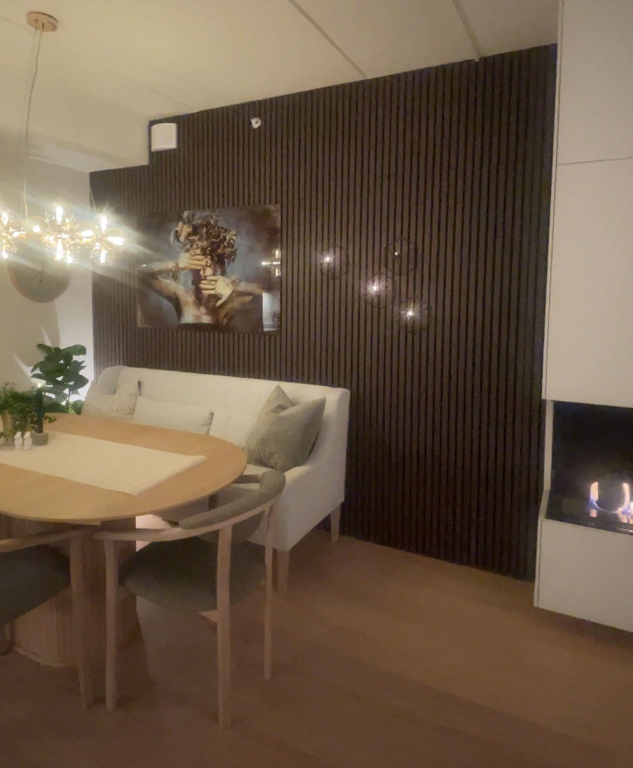 Da veggen var ferdig, var vi imponert over hvordan den forvandlet stuen! Den spileveggen ga ikke bare rommet et moderne preg, men den gjorde også at vi kunne nyte TV-kveldene uten å bli distrahert av døren.